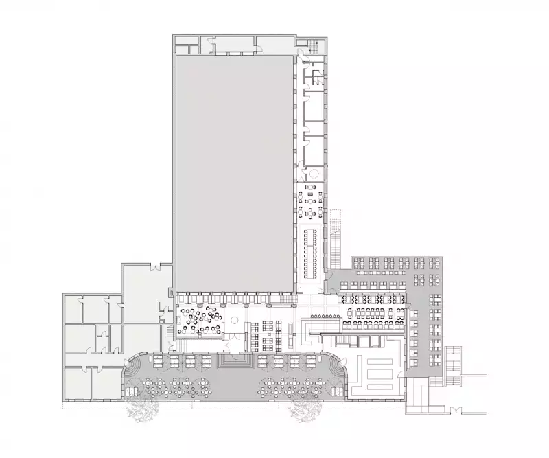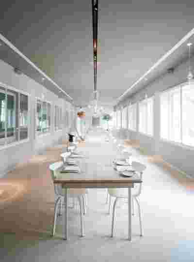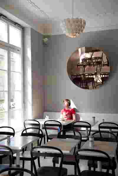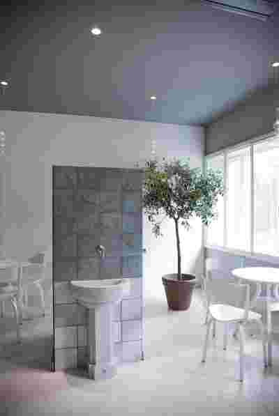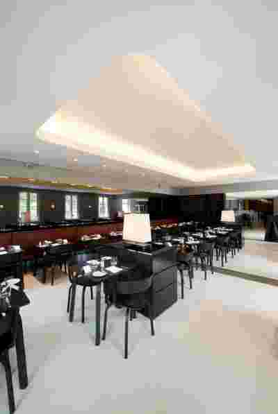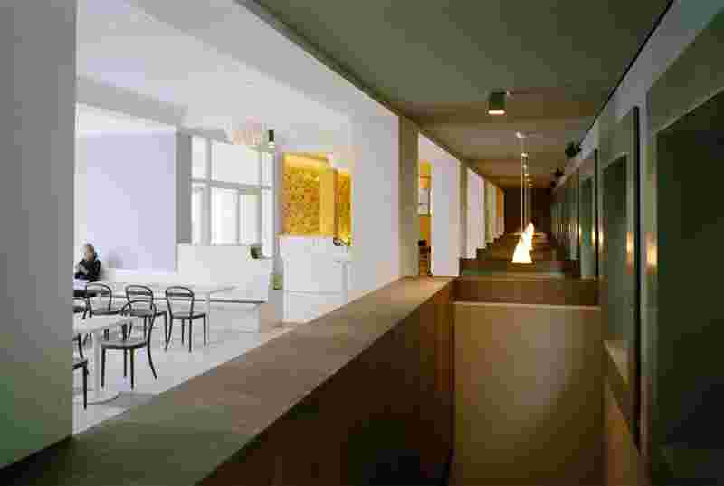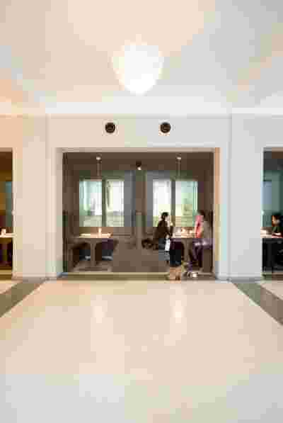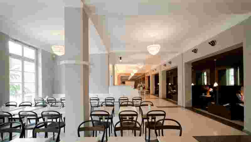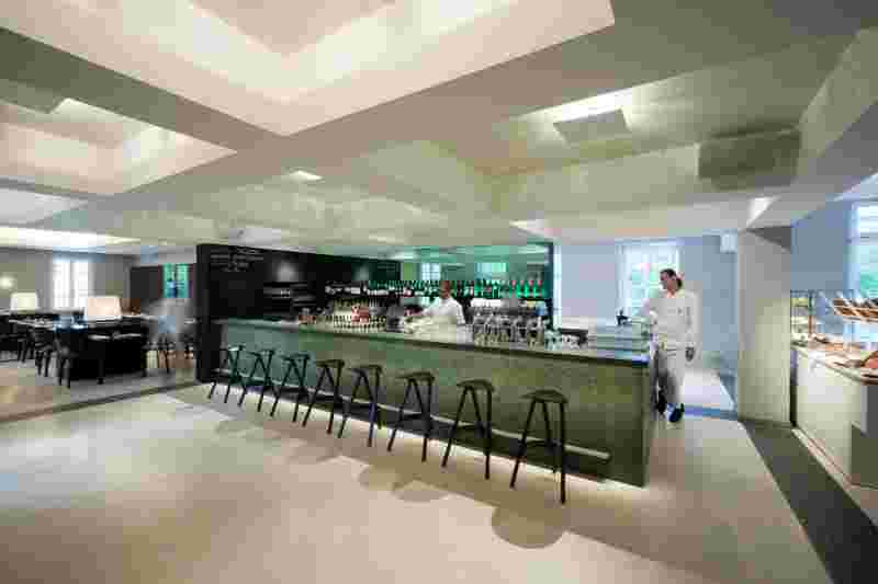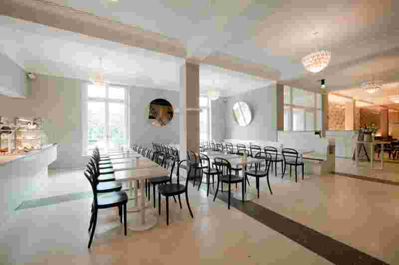 Angesichts der vielfältigen räumlichen Qualitäten und der Größe des Lokals wurde dieses in unterschiedliche Bereiche gegliedert, die alle eigene Ausprägungen haben: den Salon, das Kaffee, die Nischen, die Bar, das Restaurant und die Orangerie mit ihrer jeweils ganz eigenen Atmosphäre. Den Zusammenhalt schafft der durchgehende, helle Terrazzo-Boden. Als wesentliche räumliche Veränderung wird der neue Bereich der Orangerie zum Lokal geöffnet. Die Reithalle ist nun sehr viel deutlicher vom Lokal umlagert und Sichtbezüge sind hinzugekommen.
