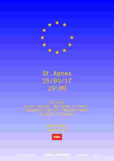 Am 25. März 1957 wurden die Römischen Verträge – die Grundlage der heutigen Europäischen Union – unterzeichnet. Anlässlich dieses 60. Jah- restages findet am 25. März 2017 in St. Agnes eine Veranstaltung statt, die sich mit Fragen zur Zukunft der Europäischen Union beschäftigt. In Zusammenarbeit mit morePlatz setzte die in St. Agnes beheimatete KÖNIG GALERIE im letzten Jahr ein Zeichen, als an der Fassade der ehemaligen Kirche eine EUROPA-Lichtinstallation angebracht wurde.