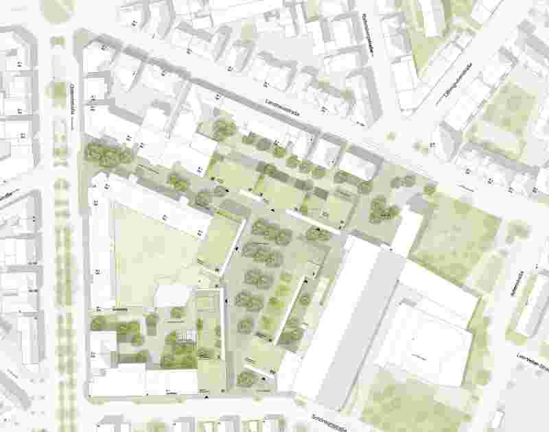 The existing structure is part of a homogeneous urban space in the eastern part of the city of Stuttgart. Grown three- and four-storey buildings accompany street spaces of the Gründerzeit in partly open construction and thus convey a characteristic impression of the place. The later interspersed row buildings of the post-war development also fit in with this urban idea. However, the design perimeter differs significantly from this in its current state. It describes a kind of amalgam of three city blocks and lacks a defined idea of an inner space of the structure.