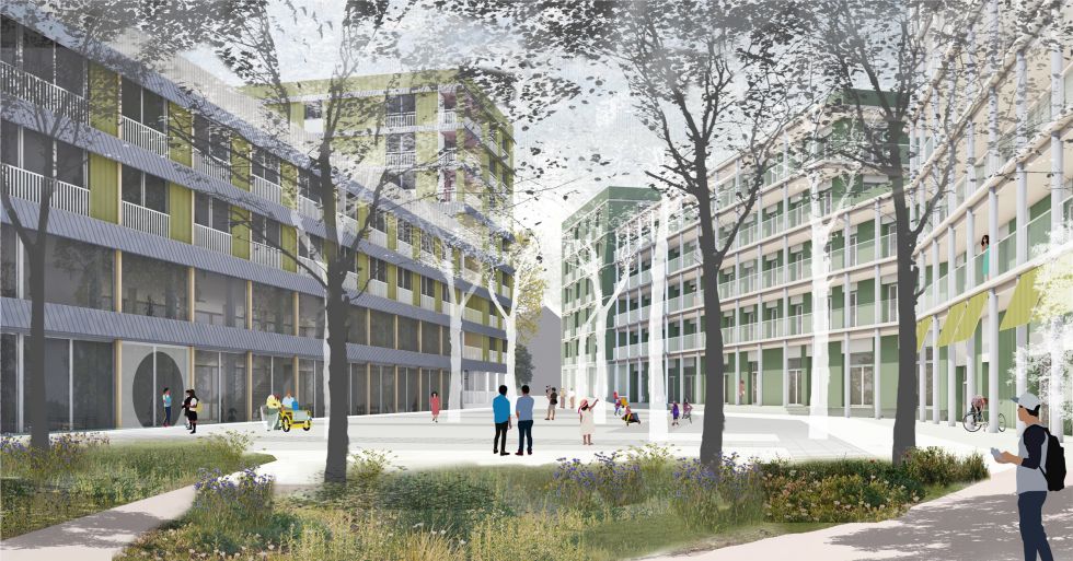 The new market square is an important new reference space for the surrounding neighbourhood. At the same time, it also serves to link existing neighbourhoods in the Ostend quarter and thus also demands corresponding barrier-free accesses to the existing urban spaces. These will be designed as places with large trees. The central area of the market, which is not built under, allows for the planting of numerous large trees with a direct earth connection. A possible redevelopment of TG does not endanger the permanent preservation of these trees. As sun protection and to realise high evaporation, this measure optimises the microclimate of the place and creates pleasant conditions for residents, guests and market people. Here, children also play under the trees and take advantage of the space in the city. In this way, the market square complements the open space on the roof of the library and the western residential development.