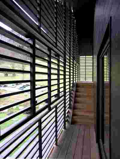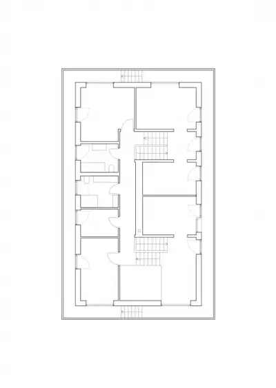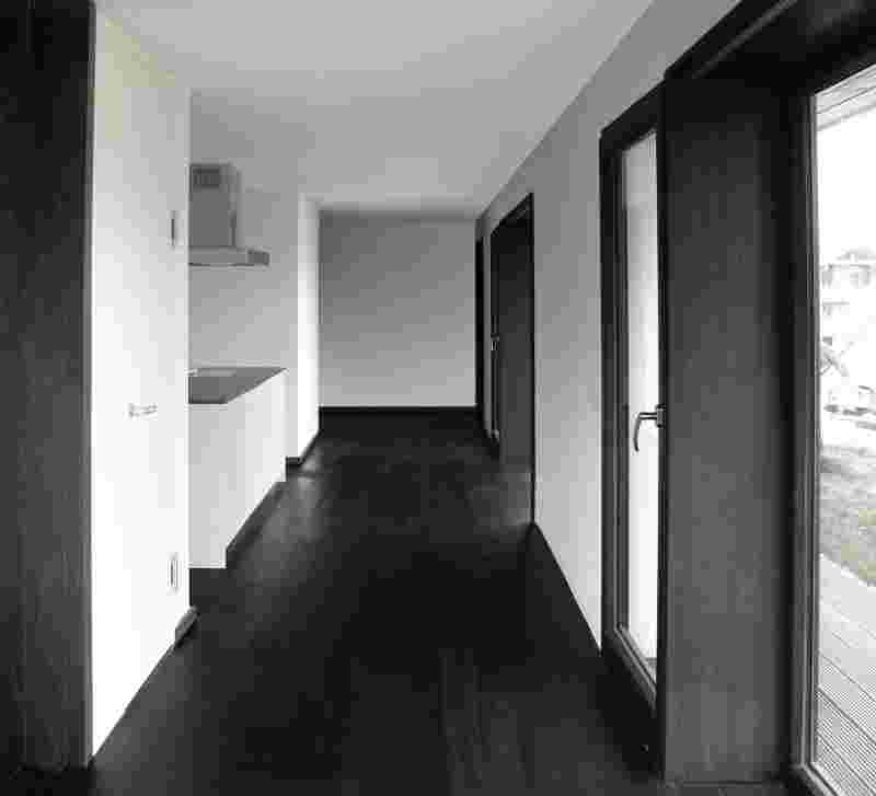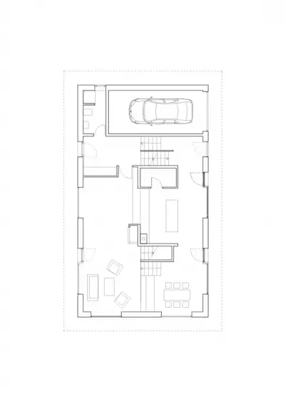 This measure and the large openings in the façade on the ground floor create a strong spatial connection to the outside space. The internal development of the house allows for a variety of spatial connections via two staircases of the same type and is complemented by the circumferential balcony. The surrounding balcony, which is protected by a slatted cladding, creates an additional offer for the bedrooms and children's rooms on the upper floor: a space that is both interior and exterior.