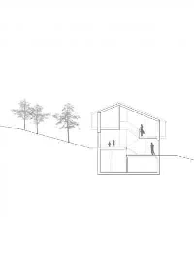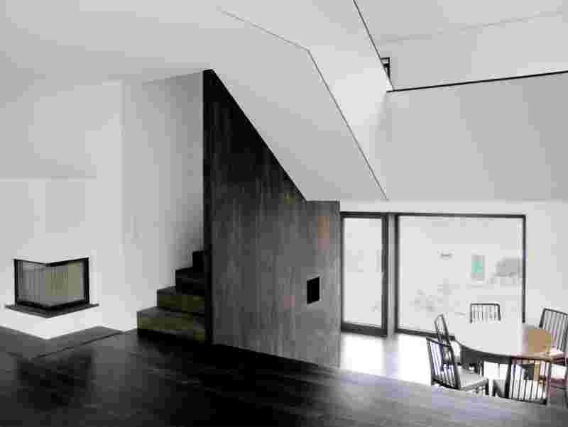 In its choice of materials and construction methods, the house is oriented towards typical local features. The open ground floor in plastered masonry forms the base on which the compact, closed upper floor with its uneven pitched roof rests in dark glazed wood.