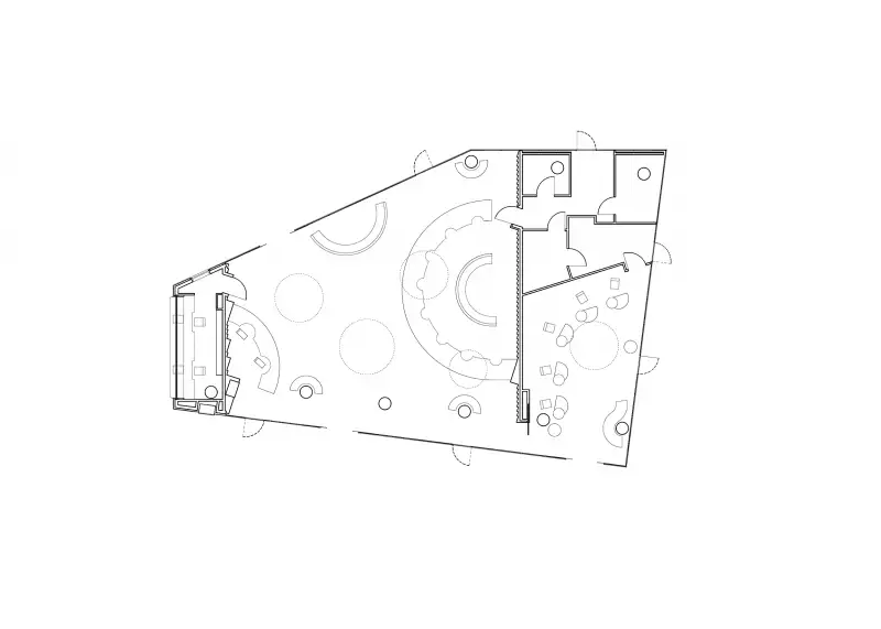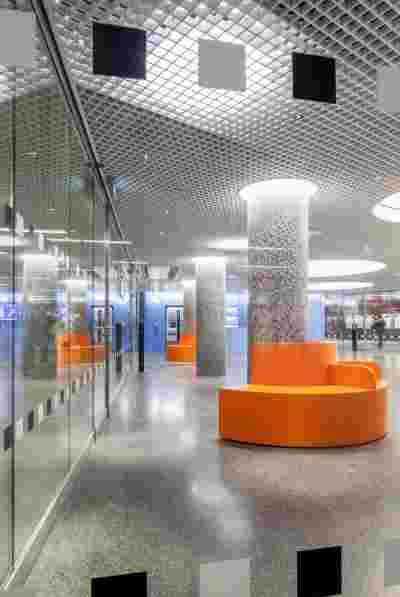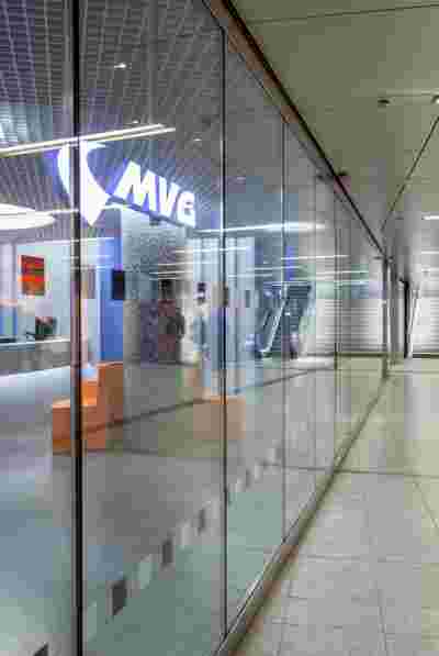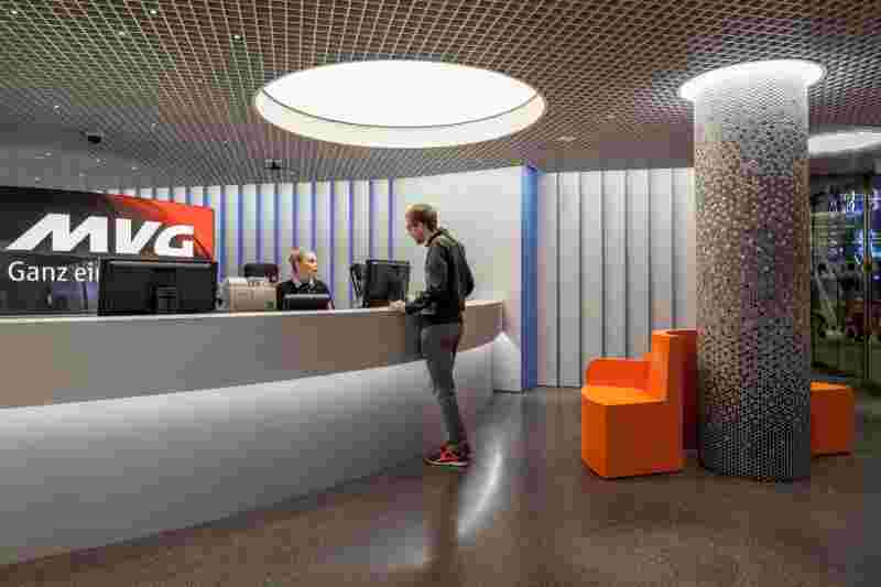 The new customer centre of the MVG (Münchner Verkehrsgesellschaft) is located on the barrier floor of Marienplatz. The customer centre stands freely in the space of the adjoining passage and has a continuous glass façade. This flowing, open situation is specified and organised in the design. A seamless ceiling in the form of a grid ceiling and a seamless floor made of bituterrazzo support this character. A few volumetrically simple objects structure the flowing space.