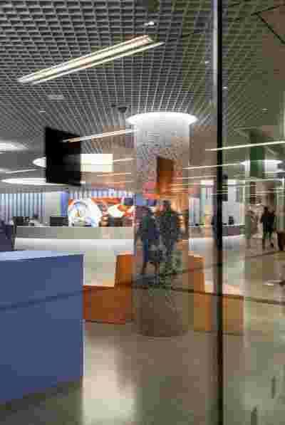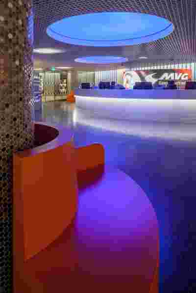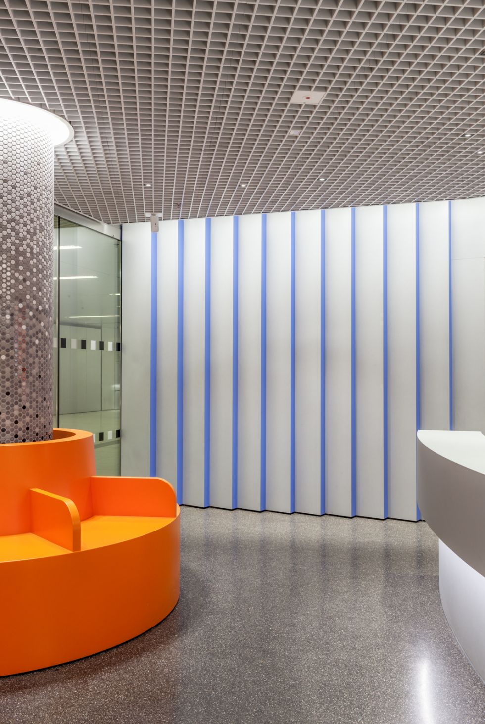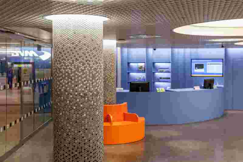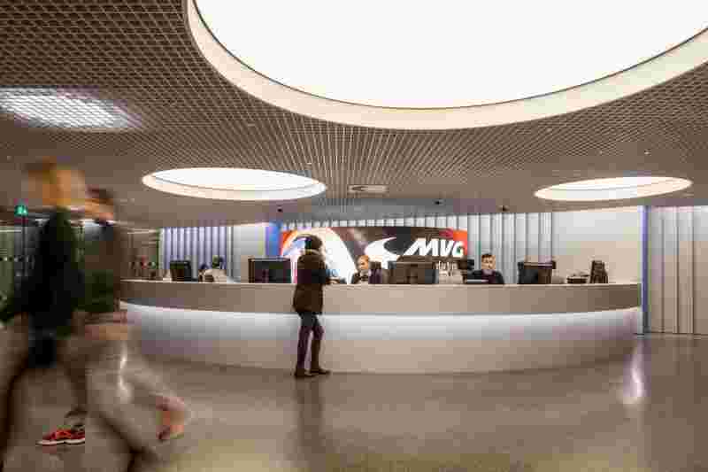 The space of the centre spans between two transverse walls. The main side with the large, radial counter on one side and, opposite, the so-called first contact: for reading, for filling out forms. The two sides get calm but high-quality designed back walls: a folding in the two colours of the MVG (blue and silver), depending on the angle of view the wall appears more blue or more silver. The respective proportion of blue and silver is different; thus one back wall appears bluer and the other back wall more silver.