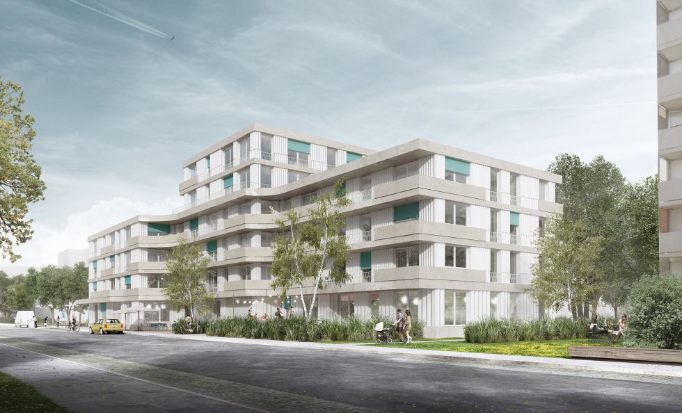 Careful consideration was given to which typologies would gain in their urban context as an object through the addition of a storey and contribute to the newly created urban structure. The 4-storey point house type was chosen, which is found west of Appenzeller Strasse and north of Bellinzona Strasse. In the new urban context, the existing point buildings are given more prominence as high points. The 2-storey extension creates a new building. The exclusive offer of 4-room flats is extended by 2- and 3-room flats, thus creating the prerequisite for a more multi-layered house community. The four-storey existing building with its protruding loggias, the vertical window strips and the large-format exposed aggregate concrete slabs is partly continued to the base and partly supplemented in its volumes. The structural relationship to the existing building is created by joining partial volumes together. The plasticity of the building is strengthened by a white, finely meshed expanded metal cladding. The extension is being built as a timber construction (panel construction), which offers a great advantage due to its high degree of prefabrication and its lightness. The construction method allows for a shortened building process and thus leaves the existing tenants undisturbed as far as possible.