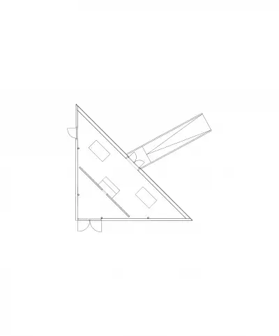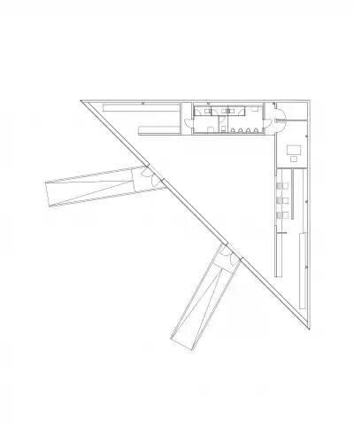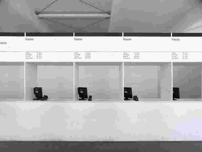 The triangular buildings’ rotated positions guides the visitors between the two exibition spaces. The smaller building contains the bookshop Walther König, the larger building houses the visitors office, ticket counter, safe-deposit boxes and toilets. With close to 400.000 expected visitors it seemed necessary to separate the service facilities from the main buildings while designing the temporary buildings in harmony with the surrounding buildings at Königsplatz and Lenbachhaus.