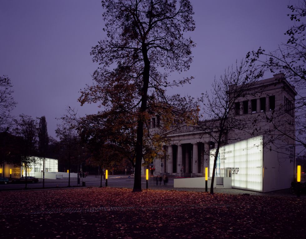The pavilions do not try to compete with the prominent architecture at Königsplatz, they, however, maintain independence and self-confidence. Their diagonally situated fronts, facing the plaza, form a new, well proportioned and iluminated public space. From the outside, the triangular buildings are perceived as billboard-like facades, not as space-containing volumes, their geometry only becoming apparent when being entered. During the day, daylight falls through the translucent facade, while during dusk and at night the entire surface is shining and illuminating the space in front of the pavilions.