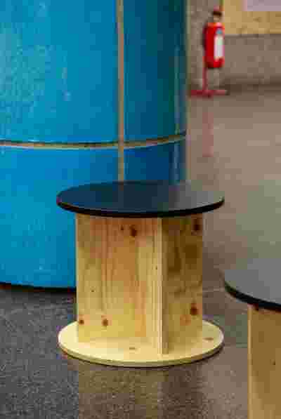 The existing building: wall and floor remain untouched, the installation on the ceiling is openly guided. The back office and the 5 counselling stations are located on an adjusted platform. The counselling stations, which are oriented diagonally to the room, resemble packing crates that can be set up for short periods and quickly taken down again. The furniture is made of simple maritime pine boards and lacquered with a high-gloss finish. In this way, something very cheap becomes very valuable. In the room there are loose stools to sit on. Under a large pendant lamp, a special place is defined in the flowing space.