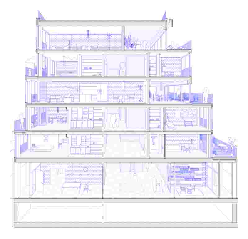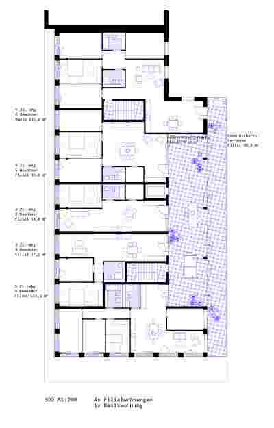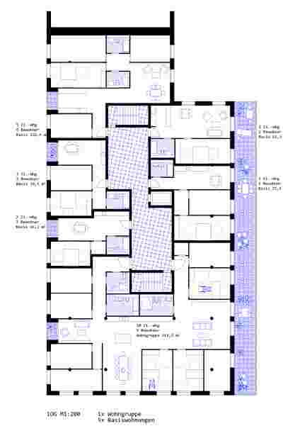 The development structure conceptually follows the logic of the building structure and the housing forms. Depending on the situation, the flats are entered via the interior hall or via the exterior communal winter garden. In this way, the development adapts to the respective living scenario. The different types of housing are distributed in the house according to location and access type. Basically, we propose many identical rooms that can be programmed according to need.