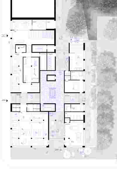Residents enter the central hall through a threshold space between the square and the cafeteria. Another threshold space is found at the transition to the courtyard, which allows a view through the depth of the building. These spaces complement the open space; the project argues for more open spaces inside the house with the two-dimensional courtyard development: the house is the courtyard!!!