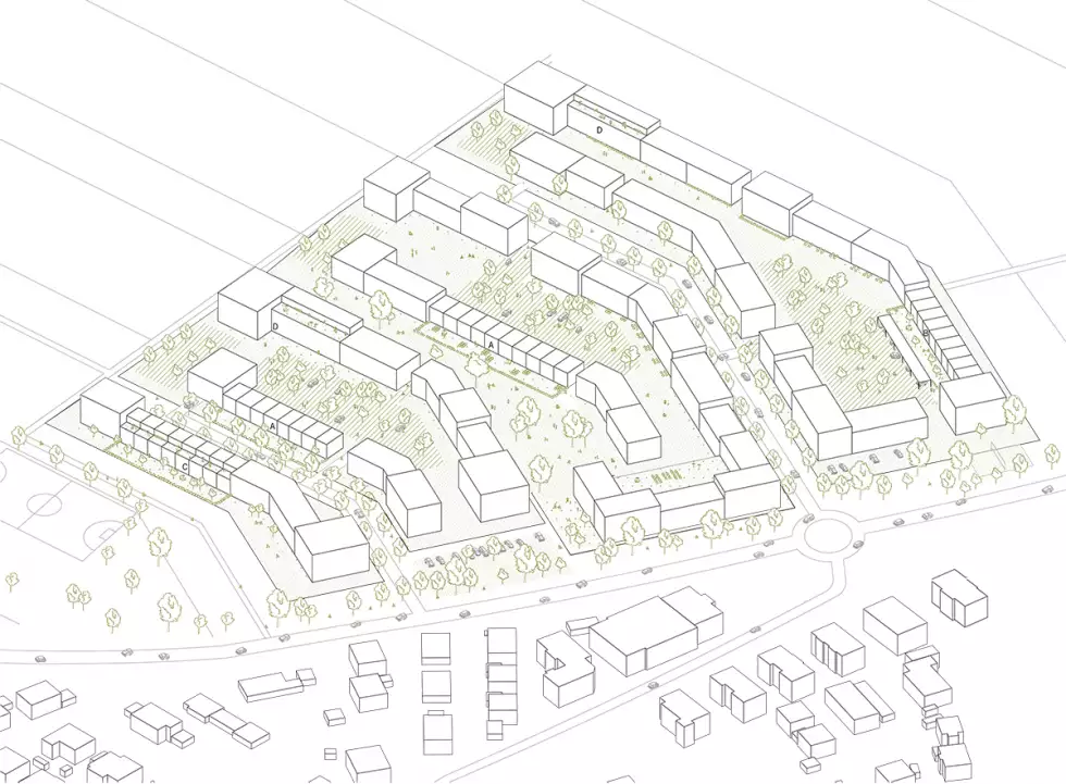The location to be redefined, close to the northern city limits of Ingolstadt, situated between the meadows in the north and the district of Etting in the south, very close to a large car factory, offers the opportunity to think about new settlement structures and their qualities. Beyond the demands of a marketable and pleasing designation of individual, land-intensive plots, aspects of social coexistence, ecology, but especially the qualities of public space need to be rethought here. How can an authentic and high-quality spatially sustainable situation be created at this location, on a slope that gently slopes down to the north towards the open field? The concept focuses on the themes of "togetherness at the new, growing edge of the village", "appropriately designed public space and settlement", and "a sense of living in the spatial generosity of the corridor".