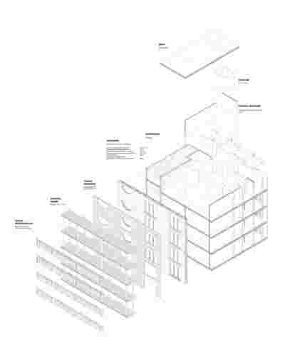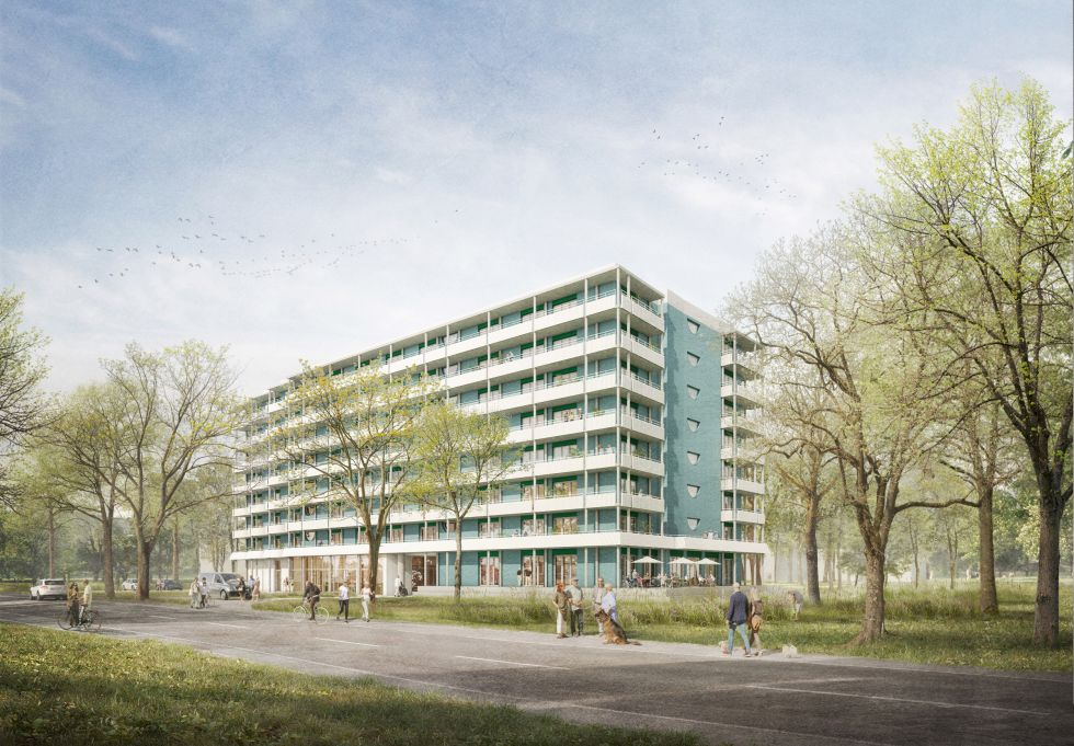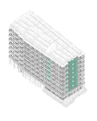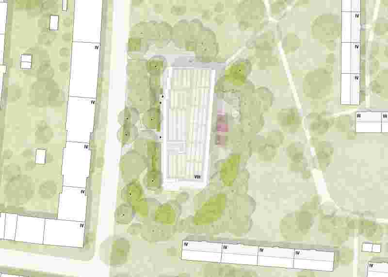 The new replacement building for the Thomas Wimmer House is confidently positioned as an eight-storey residential building on the familiar site. Compared to the current location and the proposal of the preliminary decision, the building is positioned further to the north and, thanks to its compact, efficient design, manages to preserve the existing green area to the south and secure it as a valuable, overgrown open space for the residents. The widening and alignment of the building cubature optimises the natural lighting and allows an increased building depth, creating an efficient, economical and spatially qualitative concept for the building and a good floor plan design for the flats.