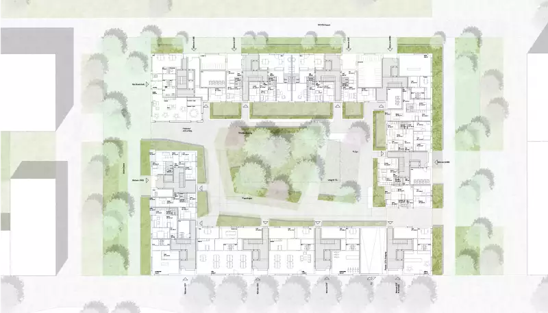 All houses are accessed from the public space. The ground floor flats facing the green alleys are organised as mezzanine floors. The flats are all organised barrier-free and eligible for subsidies. All multi-room flats are oriented on two sides and have a balcony or loggia. The ground-floor flats have small terrace-like exits to the courtyard. The flats of the KMB model are located in the high point, MMM and EOF are distributed realistically in the other building blocks.