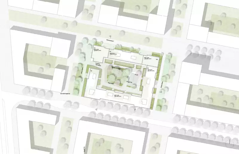 In this clearly comprehensible structure of designed urban spaces and set edges, an urban building block is developed in logical consequence that meets the requirements for types of use, residential mixes and flat sizes and develops a precise architecture from them.