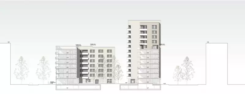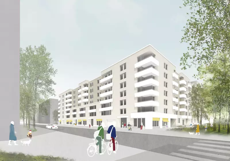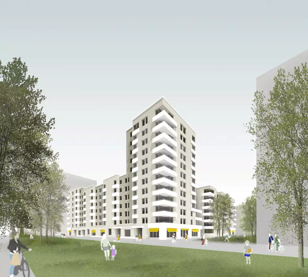 The accentuations are introduced by means of various creative devices. In order to counteract an inappropriate massiveness of this form, the design adds various contouring modulations to the building block. For example, the corners of the setting are proposed as open loggias throughout. This acts as a scale-giving, but also as a mediating gesture between the urban spaces perceived "across the corner". The staggering of the central building blocks of the structure to the north, south and east creates a continuous edge to the street space at the base. Towards the southern ring road, this base measures the lower three storeys. Non-residential uses enliven the street space here. To the north, facing the Grüne Boulevard, the offer of studio flats strengthens the public character of the boulevard. In the courtyard opening to the south of the high point, the south-facing open space of the neighbourhood meeting place determines the atmosphere and creates a gentle threshold at the entrance to the courtyard.