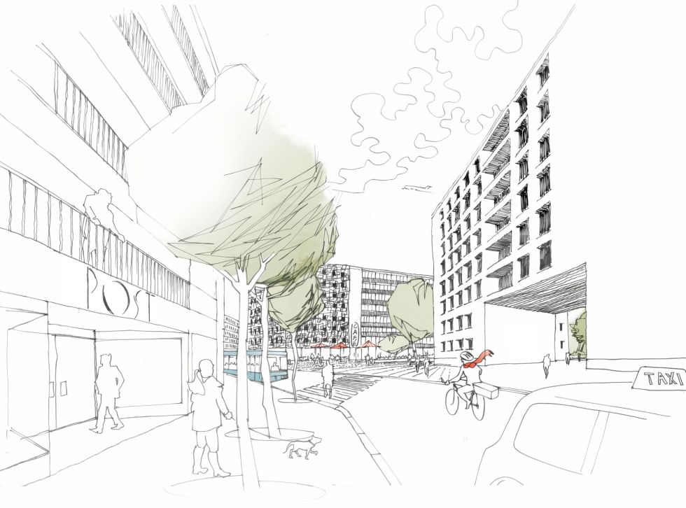 The public spaces are designed alternately as classic street spaces but also in reference to the wide spaces of Neuperlach. The partially flowing space along the street and towards the park forms a deliberate contrast to the more urbanised narrower subspaces; the ambivalence of the spaces is an essential aspect of the project. The courtyards of the terraced buildings that open onto the street are reminiscent of the spatial characteristics of Neuperlach. The courtyard buildings open up at various points and form partial spaces above head buildings. This "openness" is another component of the "Neuperlach feeling".