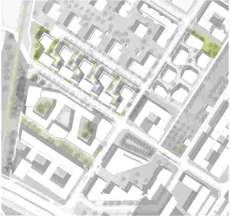 The aim of the planning is to achieve an urban spatial revitalisation of the southern Parkstadt Schwabing. There is the rare opportunity to create and design a "critical mass" for urbanity. Three different urban modules, developed explicitly for the site, occupy the four building sites. The new, spatially, functionally and typologically hybrid structures create clear urban situations and unambiguous addresses in the city. The concept is based on locally found scales and grains. In the field of MK 4, a chain of interlocking houses forms the protective end of the existing residential development to the north. As a visible interpretation of the residential theme, however, the typology of the high-rise building introduced on the site also seems appropriate. In combination with a flatter conglomeration of three courtyard spaces, a new, dense urban building block is formed that appears familiar at the site. This creates a kind of urban prelude to the neighbourhood at the southern entrance to Parkstadt and towards the tramway. The newly defined street space of Anni-Albers-Strasse is formed by building sections of different heights. It leads to the newly created Lionel-Feininger-Platz. Temporary living, residential and working addresses are located there. The new southeastern high point complements the urban spatial aspirations of this neighbourhood square. Finally, east of Lionel-Feininger-Strasse, on the combined building sites of MK7N and MK9S, a structure of buildings as a permeable setting of similar building blocks mediates between the dense urban space of housing in the west and the park in the east. In the north of the development area, two of the building blocks contain a combined daycare centre on the ground floor with open spaces facing east.