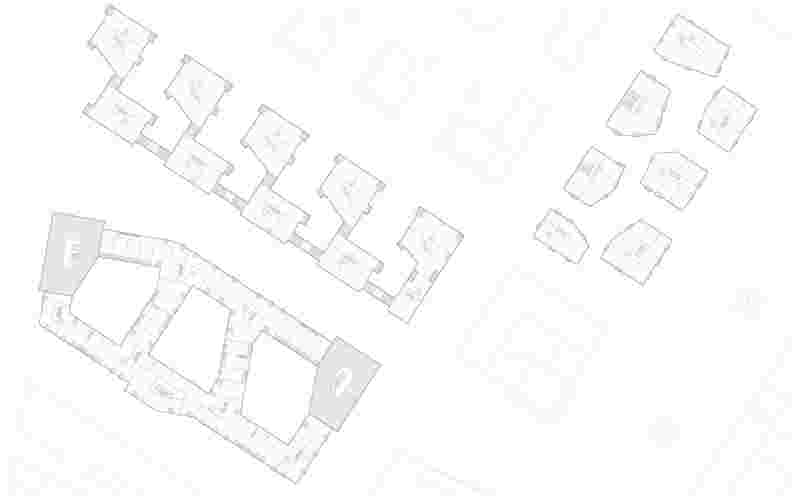 The relatively high density of the neighbourhood demands precise consideration of suitable typologies that do justice to the potential of the "vertical individuality" of the existing buildings on the one hand, but also to the collective need for neighbourliness as a quality of urban living. Very different typologies promise this urban atmosphere. On the building site of the former MK 4, linked 6-7 storey townhouses, connected with generous winter gardens to the south as well as in the interior, address Anni-Albers-Strasse in the south and Lilly Reich Strasse in the north. Balconies with loggias facing open, atrium-like spaces promise a good quality of living. The partly polygonal shape of the building elements ensures good lighting for the flats. In the northern part, there is a day-care centre with the corresponding open space. A combination of different residential typologies is found on the field of the previous MK 3. Two-storey townhouses, some of them stacked, are grouped around the three four-storey courtyards and alternate with multi-storey flats. The roof surfaces of this courtyard combination are planned as a common roof garden. Depending on the orientation, the buildings are accessed directly from the street, from the outside, or via the middle of the three courtyards. The middle high-rise building also has its entrance here in the courtyard. These differentiated types of development promise clear addresses. In the other two high-rises, small shops or other uses for daily needs are located on the ground floor, in keeping with their position in the urban space. On the two floors above, offices and medical practices are planned. Above this, there is a combination of flats, interspersed living landscapes, efficient 2-room flats, family flats and spacious panorama flats in the upper floors.