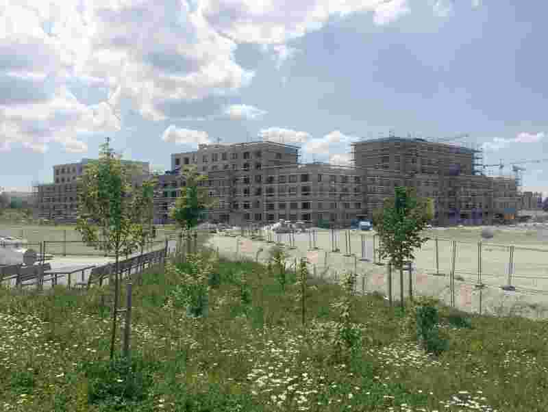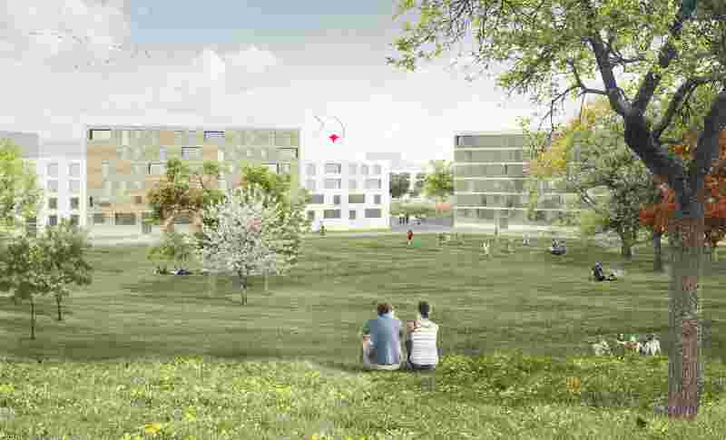 A generous landscape park with its topographically shaped edge protects the neighbourhood in the south and east from the noise emissions of the railway. It also links the surrounding open spaces - the park "Am Durchblick", the Würmkanal and the Nymphenburger Park - with the neighbourhood.
