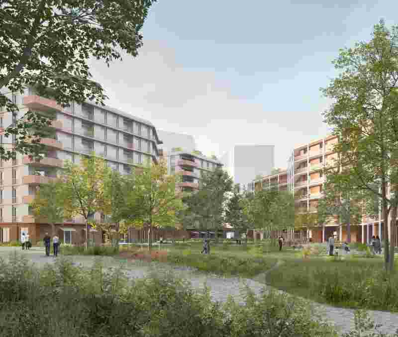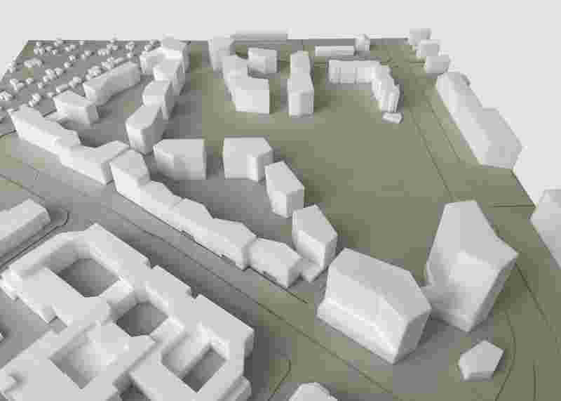 The eastern part of building block WA3, developed in the process, consequently has different urban spatial levels of impact. Three buildings with slightly different colour schemes on a common base create a relevant façade along the street space of Westendstraße, offer a passageway to the new park halfway along and spatially connect to the passageway of the high points and the underground station access. At the same time, the entrance to a daycare centre is created. In the northeast, the two polygonal building blocks form the southern boundary of the new park and create a relevant setting for this green space. At the same time, however, the building components also provide a spatial frame for the communal open space for residents in the inner courtyard. The design guidelines describe an initial picture of the effects of the different building components. The solitary polygonal buildings thrive on their all-round effect. Opposite, the continuous, angled façade creates the desired spatial cohesion.