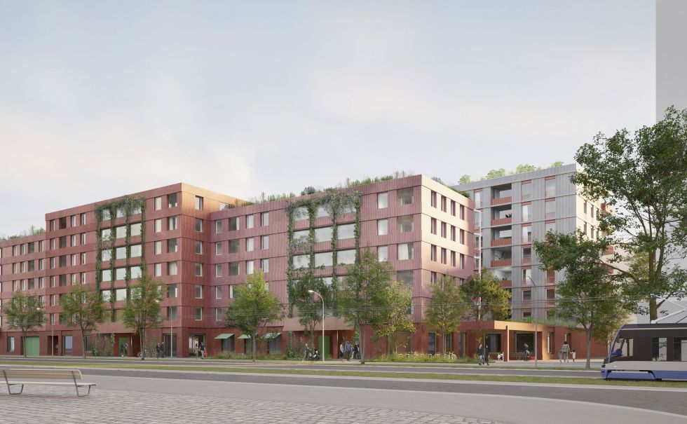 The neighbourhood on Zschokkestraße is transforming from a fenced-off depot into an open living space for a new community. The location currently tends to be characterised by its eastern neighbourhood, i.e. a commercial character, and in future will become an important urban space linking the ‘Alte Heimat’ to the west, the neighbourhoods to the south and the Westendstraße underground station in the north-east. In future, this important landmark will be accessible via a passageway between the two striking high-rise buildings. Opposite the construction site of the present project is the striking large structure of TÜV Süd.