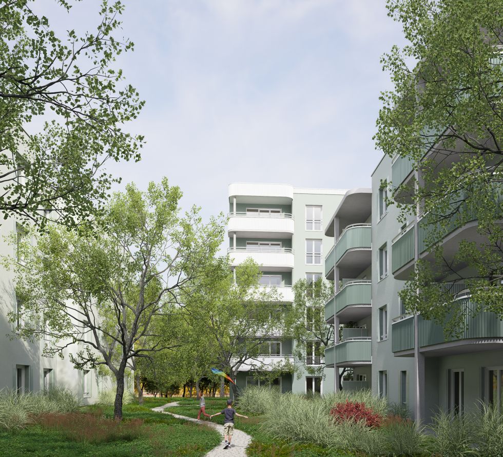 Die Gebäudegruppe umrahmt einen gemeinsamen grünen Innenbereich, welcher sich bis hin zum Engelhaldepark erstreckt und somit die Parklandschaft für alle vier Gebäude erlebbar macht.