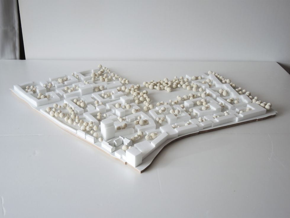 Malerisch geformte, autofreie Wohnstraßen reichen bis zum bis zum Quartierspark. Unterschiedliche öffentliche Nutzungen schaffen urbane Situationen im Quartier. Um dieses räumliche Gefüge der kleinteiligen Nachbarschaften legt sich ein markantes Band, das die Wohnquartiere schützende Gewerbe- und Dienstleistungsnutzungen aufnimmt oder robuste Formen des Wohnens aufnimmt.