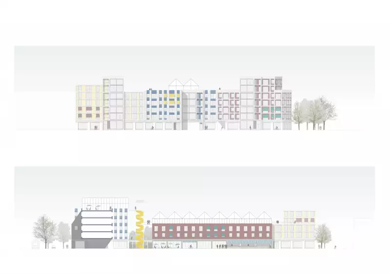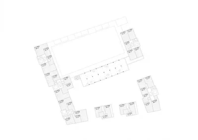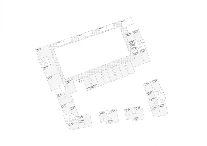 Der Begriff „Zusammen“, der uns für das Selbstverständnis der wagnis elementar erscheint, soll uns weiter durch die Entwicklung des Konzeptes begleiten. In dieser Nachbarschaft soll und kann die Genosschenschaft wagnis ein wichtiger Partner sein. Die Gebosssen sind die Bewohner eines integrativer Bausteines, die in die nachbarschaft vermitteln als - ein städtisches Projekt der Vielen. Ein durchgängig (un)gleiches Ganzes entsteht. Ein Arrangement der Möglichkeiten, der unterschiedlichen Qualitäten und Lagen soll den Stadtraum prägen. Diese Lagen bestimmen die beschriebenen Nachbarschaften und auch unsere Interpretation des städtebaulichen Entwurfs. Der im Inneren des Perimeters festgesetzte, dreigeschossige Baustein trennt räumlich zwei unterschiedliche Teilräume und wird zur Mitte der Überlegungen.