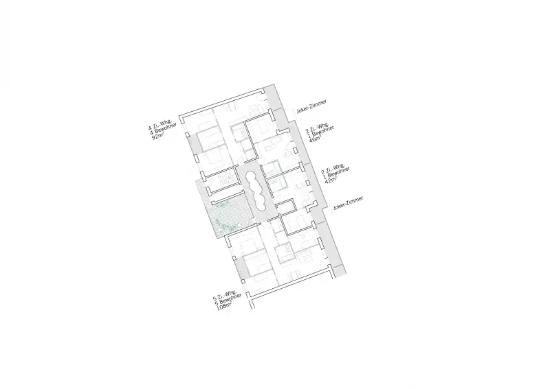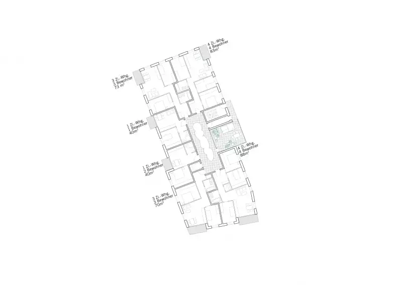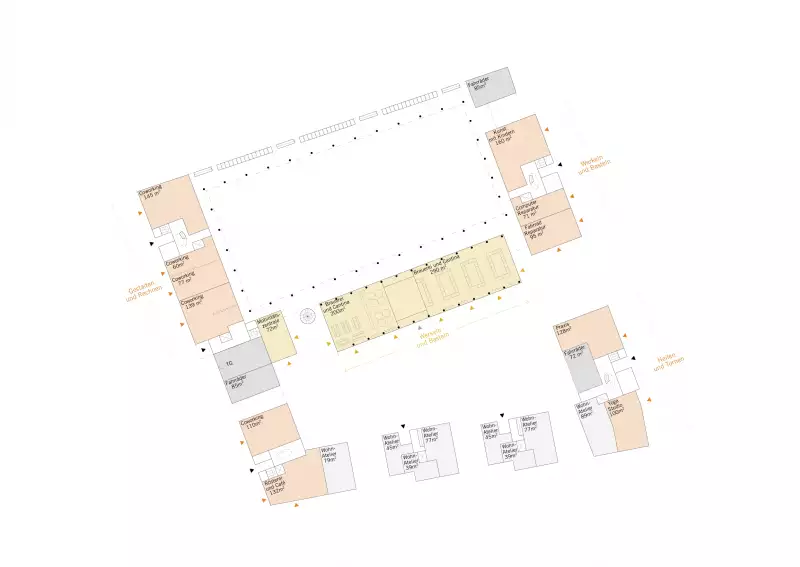 Die Häuser ordnen sich nach verschiedenen Qualitäten und Atmosphären des Stadtraums. Die Gebäude umstellen das neue Quartier: Stadthäuser wechseln sich mit Hofhäusern ab, Orte der Produktion mit Wohnungen und Dachgärten. Man betritt alle Häuser von der Straße. Über eine großzügige, zweigeschossige Halle erreicht man die Wohnungen. Diese Hallen bilden das Entrée und ergänzen sich räumlich mit den ebenfalls zweigeschossigen „Gartenzimmern“ der Häuser. Eine räumliche Verschränkung der Hausgemeinschaft entsteht. Spännererschließungen lassen zahlreiche unterschiedliche Wohnungsgrößen zu.