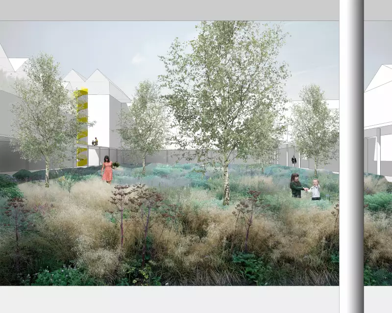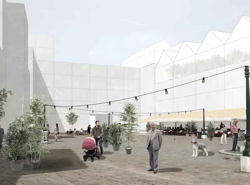 Im Süden entsteht durch die Festschreibung der öffentlichen Durchwegung eine lebendige Piazetta. Gemeinsames Kochen und Essen, Brauen und Trinken, Rösten, Basteln, Reparieren, Programmieren, Verkaufen und Kaufen bestimmen den Raum. Im Norden erinnert der umschlossene Gartenhof mit seiner umlaufenden Pergola an einen „hortus conculusus“. Als Ort der Ruhe, der Produktion, der Langsamkeit, des Werdens und Wachsens ist er ein Gartenraum für alle. Wildnis und Ordnung werden verhandelt: Baum, Blume und Rübe kommen gleichermaßen zu Ihrem Recht. Dazwischen, auf dem Dach des Markthallengebäudes, findet sich eine Orangerie, ein kollektiver Wintergarten.