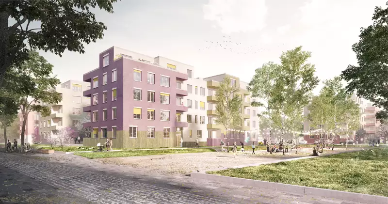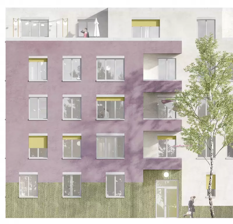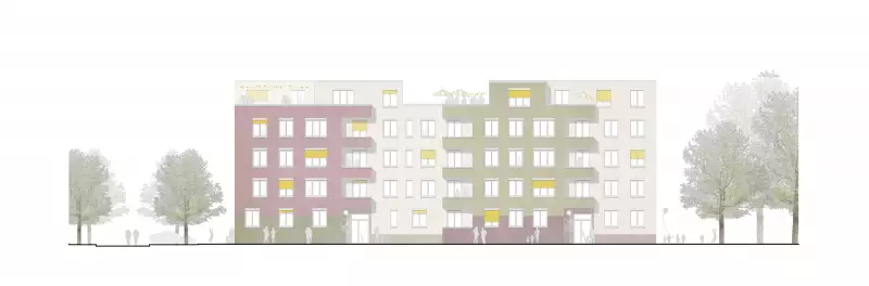 Die offene Bebauung mit Punkthäusern schafft mit einfachen Mitteln räumlichen Abwechslungsreichtum und verspricht, trotz Wiederholung der Bausteine, ein stadträumlich spannungsreiches Wohnumfeld. Die Architektur zeichnet sich durch Einfachheit aus und erinnert an Berliner Siedlungsbauten der Moderne. Die Baukörper werden durch ihre Tiefenstaffelung und durch die Anordnung der Balkone räumlich abwechslungsreich und bauplastisch gestaltet. Mit der Platzierung der Balkone verzahnen sich die verspringenden Fassadenebenen und an Gebäudeecken wird das Volumen gebrochen und aufgelockert. Die Bauplastik wird durch unterschiedliche Farbkombinationen gesteigert und damit auch die situative Unterschiedlichkeit unterstützt.