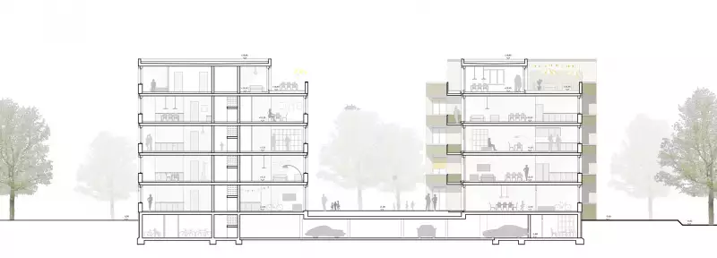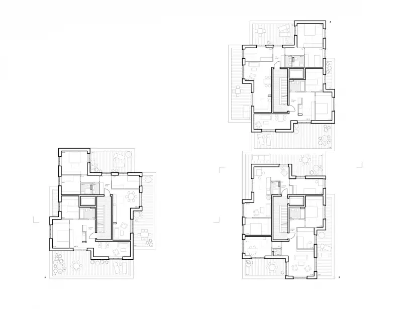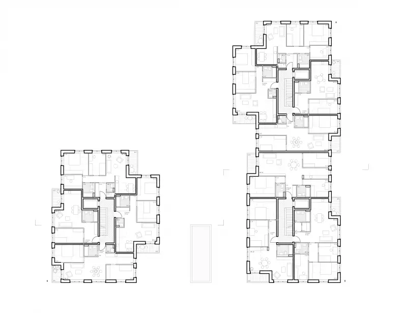 Die Block-, Zeilen- und Mäanderstrukturen setzen sich aus einem ähnlichen Gebäudetypus zusammen. Die einzigen Varianten bilden die unterscheidliche Behandlung der Nord-Süd oder Ost-West-Orientierung und die Ecktypen. Die Gebäude präsentieren sich mit einer städtischen Aussenseite, die mit Loggien und Erker gegliedert wird und einer Innen- oder Hofseite mit Balkonen. Jeder Gebäudetyp bietet die Möglichkeit den Wohnungsmix durch Schalträume anzupassen.