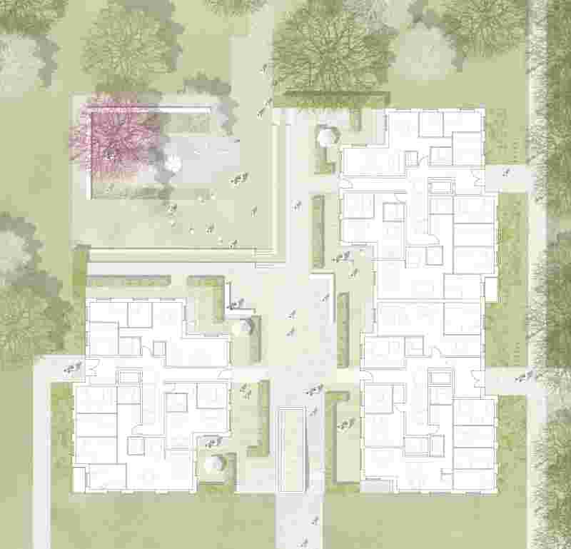 Die offene Bebauungsstruktur vermittelt, sowohl zur Allee wie auch zum Straßenraum mit definierten Zwischenräumen und stellt Durchlässigkeit und Offenheit her. Die „giebelständigen“ Gebäude schaffen eine abwechslungsreiche Raumabfolge. Zur nördlichen Grundstücksgrenze nimmt die Bebauung gebührenden Abstand zu der kleinteiligen Nachbarbebauung. Ein Grüngürtel mit schützenswerten Baumreihen findet sich dort. Durch die vor- und rückspringenden Baukörper entsteht eine räumlich abwechslungsreiche und sich mit der Landschaft verzahnende Raumabfolge.
