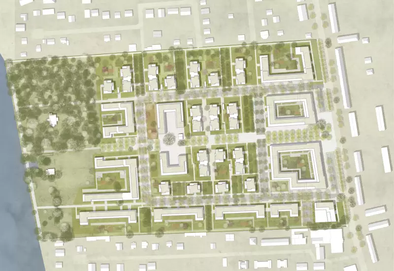 - in Nord-Süd Richtung orientierte offene Bebauungsstruktur, welche die Besonderheit der bestehenden Landschaftselemente interpretiert und die Durchlässigkeit des Quartiers herstellt.