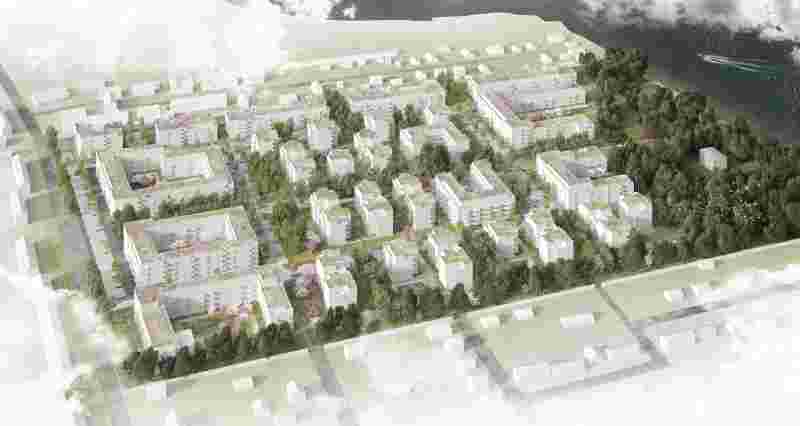 - mäandrierenden Zeilen an der westlichen und südlichen Quartiersgrenze, die sich zum Landschaftsraum hin öffnet und das Quartier nach innen stadträumlich fasst.