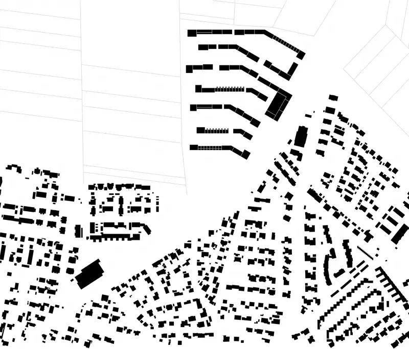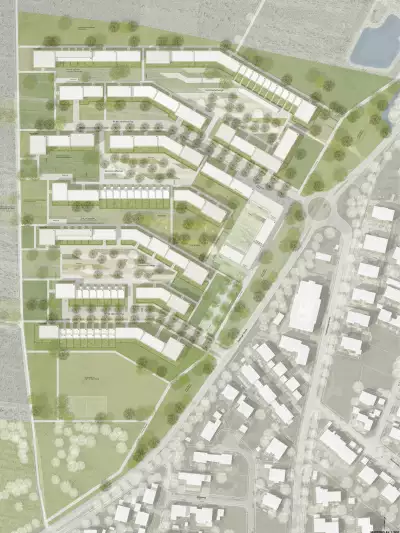 Die Hausraine bilden sich aus verschiedenen Haustypen und Eigentumsmodellen. Reihenhäuser und Mehrfamilienhäuser in unterschiedlichen Typologien wechseln sich ab. Hier entsteht eine Nachbarschaft, die über das bloße nebeneinander Wohnen und Rasenmähen hinausgeht. Im Osten, am Quartierseingang über den neuen Kreisverkehr, finden sich die öffentlichen Nutzungen wie Einzelhandel und Dienstleistungen. Im Süden des neuen, kompakten Quartiersbausteins findet sich die KiTa. Sie wird von der südlichen Straße erschlossen und orientiert sich mit den Freianlagen nach Westen, zum zentralen gemeinsamen Grünraum - der Allmende. Diese liegt geschützt in der Mitte des neuen Stadtteils und ähnelt typologisch den Flurangern. Sie öffnet sich im Westen zu den angrenzen Fluren, kann aber im Falle einer Weiterentwicklung des Stadtteils nach Westen auch eine wichtige Rolle bei der Grünraumvernetzung der beiden Teile leisten.