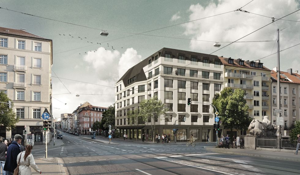 Der Entwurf schlägt vor den im Stadtgrundriss konisch zugeschnittenen Block an der Ecke Erhardt und Fraunhoferstraße im Sinne des Rahmenplans von Theodor Fischer zu schließen. Das Haus schließt zur Isarau die prägnante städtebauliche Kante und bildet den Abschluß der Höhenentwicklung dieser besonderen Häuserfront; ein maßstäblich adäquates Gegenüber zum Eckhaus an der Auenstraße wird damit geschaffen. Das neue Haus schafft mit seinem Baukörper eine neue stadträumliche Passage in die Fraunhoferstraße. Die wechselnde Höhenentwicklung der Dachkante entlang der Fraunhoferstraße wird die stadträumliche Situation stärken und in einen Hochpunkt zur platzähnlichen Aufweitung hin zur Baader- und Reichenbachstraße überleiten. Es entsteht eine prägnante Platzfassade die raumbildend in den Straßenraum wirkt und die Platzsituation fasst. Das vorspringende Gebäude unterstützt diesen Effekt durch die Verengung des Straßenraums und die klare Fassung der Platzsituation.