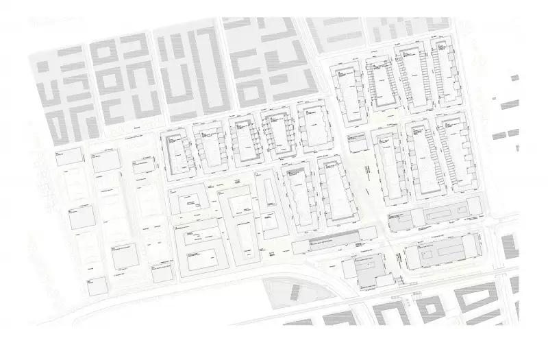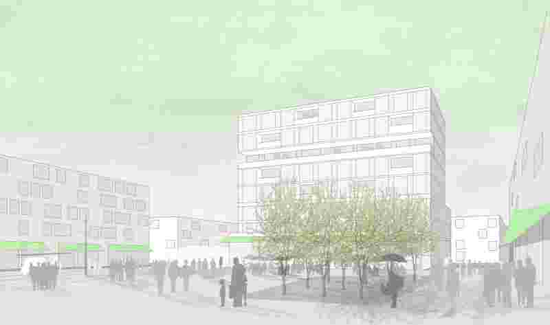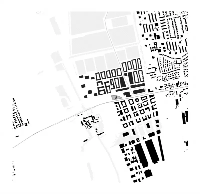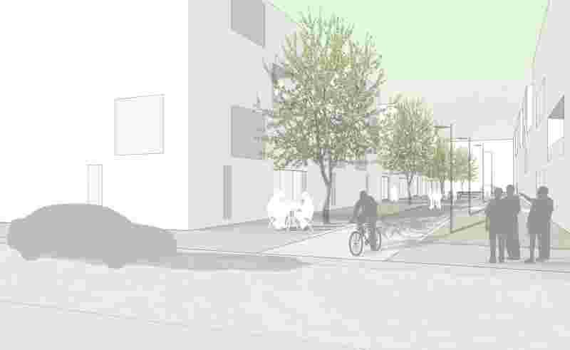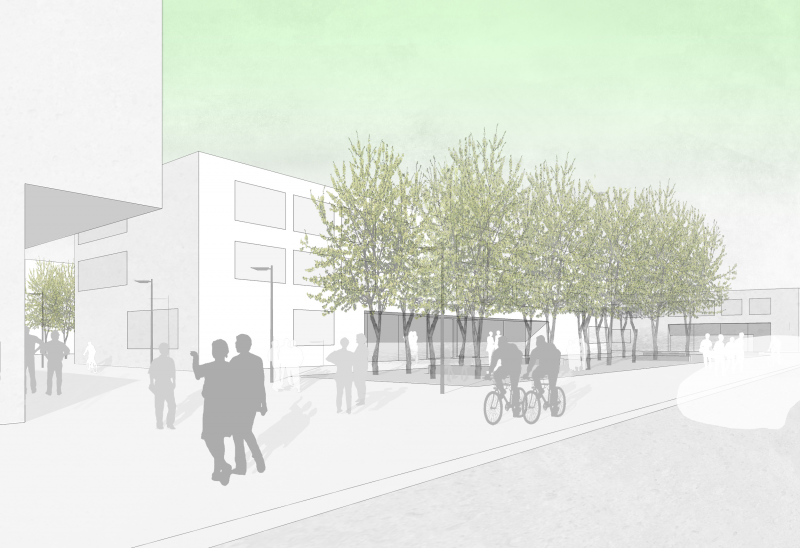 Klare Definitionen der Größen und Kanten dieser Plätze und deren programmatische Belegung erzeugen verschieden Orte im Stadtgefüge. Ausgehend von den beiden großen öffentlichen Plätzen Stadtplatz und Bahnhofsplatz im Zentrum des neuen Sadtraums, entwickeln sich die Freiräume über einzelne Quartiersplätze am Schulcampus und dem nördlichen Wohnquartier zu den, zwischen den einzelnen Nachbarschaften positionierten autofreien Gassen hin zu den privaten Innenräumen der Wohnquartiere.