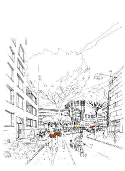 Die öffentlichen Räume werden im Wechsel als klassische Straßenräume ausgebildet aber auch in Anlehnung an die weiten Räume Neuperlachs entwickelt. Der in Teilen fließende Raum entlang der Straße und zum Park bildet einen bewussten Gegensatz zu den eher städtisch geprägten engeren Teilräumen, die Ambivalenz der Räume ist ein wesentlicher Aspekt des Projektes. Die sich zur Straße öffnenden Höfe der Zeilenbebauung erinnern an die räumlichen Besonderheiten Neuperlachs. Die Hofbebauungen öffnen sich an verschiedenen Stellen und bilden Teilräume über Kopfbauten. Diese "Offenheit" ist ein weiterer Baustein des "Neuperlach Gefühls".