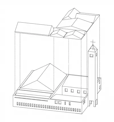 Das Haus der neuen Jugendkirche gliedert sich in mehrere Bereiche. Der Kirchenraum bleibt in seiner Präsenz und räumlichen Qualität erhalten. Auf eine bauliche Teilung des Raums wird bewusst verzichtet. Um kleineren Gemeinschaften einen angemessenen Raum für Andacht und Gebet zu bieten, wird eine Werktagskapelle in räumlichem Zusammenhang zu dem Kirchenraum vorgeschlagen. Diese ist abtrennbar und auch mit dem benachbarten Veranstaltungsräumen zu nutzen. Die Räume für Gruppenarbeit und kleinere Veranstaltungen organisieren sich barrierefrei im Bereich des ehemaligen Pfarrsaals. Durch die Einführung der Dachelemente ist es möglich die Gruppenräume auf zwei Ebenen mit Raumhöhen zu organisieren, die den neuen Nutzungen entsprechen. Die Fassade der Kirche bleibt unberührt, das Licht für die Obergeschosse kommt von oben über die neuen Dächer ins Gebäude.