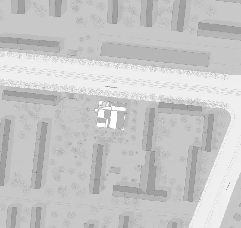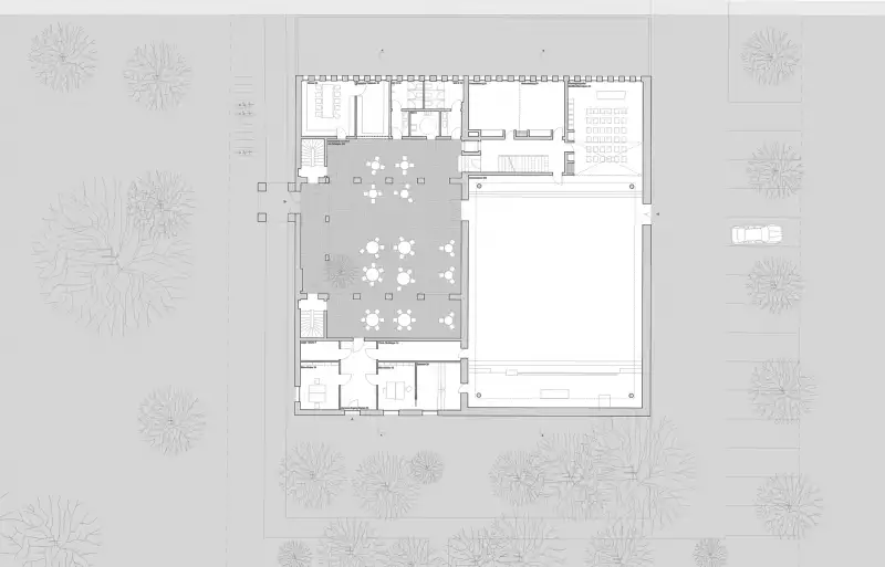 Die bestehenden Fenster im kreuzgangartigen Umgang werden ausgebaut und der Umgang so Teil des Hofraumes. Der Innenhof erweitert sich in das Gebäude hinein. Der erdgeschossige Anbau vor der Kirche wird abgebrochen. Die Kirche erhält so eine deutliche Präsenz zum Innenhof hin. Die beiden (nördlichen und südlichen) Bereiche der Büros im Obergeschoss werden durch ein neues Bauteil über dem Eingang verbunden. Über diese "Brücke" wird auch der Turm erschlossen. Im oberen Bereich finden sich die Büroräume. Diese öffnen sich jeweils zu gemeinschaftlich genutzten Bereichen für Aufenthalt und Kommunikation.