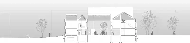 Der bestehende Innenhof erfährt durch eine Überdachung eine räumliche Umdeutung und eine bedeutende Aufwertung. Er dient als unbeheizter, durch solare Gewinne temperierter, zweigeschossiger, verbindender Innenraum – ist das Entrée und gleichzeitig ein ganzjährig geschützter Ort der Kommunikation für Veranstaltungen und als Cafeteria.