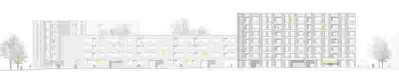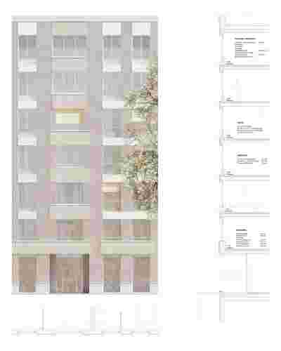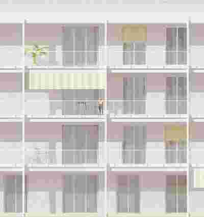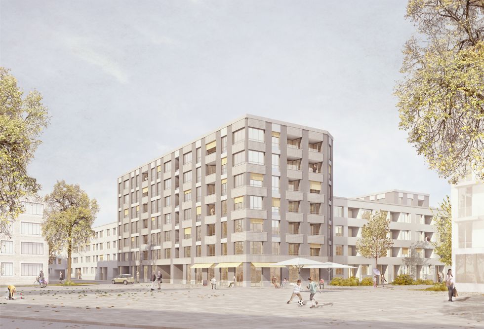 Die Gebäude sind als geputzte Mauerwerksbauten geplant. Die viergeschossige Bebebauung wird über horizontale Fassadenbänder gegliedert, diese nehmen unterschiedliche Fensterformate und Loggien auf. Hier wird nach Außen keine bodentiefe Verglasung vorgesehen; im Hof hingegen werden großzügige bodentiefe Verglasungen angeboten. Der Farbkontrast der Bänderfassaden ist weniger ausgeprägt, die Fassade spielt subtil mit Tiefen und strahlt dabei Ruhe aus. Der Sockel zieht sich in die Eingänge, die zurückversetzt den Übergang vom öffentlichen Raum über verschiedene Schwellenzustände thematisieren.