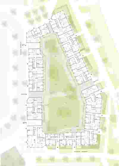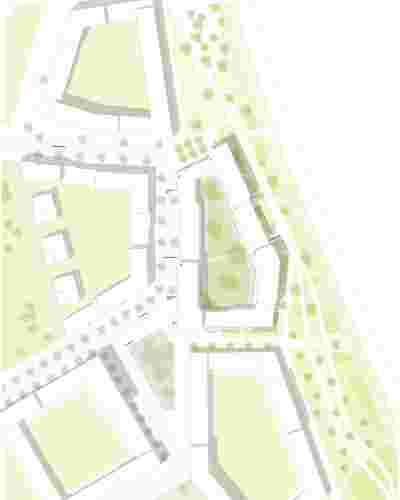Die Hofbebauung weicht an definierten Stellen von der Baugrenze zurück um den Raum zu zonieren, zu profilieren aber auch um Räume aufzuweiten und die Belichtung zu verbessern. Im Nordwesten bildet der Hochpunkt durch seine Stellung im Stadtraum und seine prägnante Schräge einen Vorplatz aus. Dieser stellt einen deutlichen Bezug zu dem Platzraum aus dem ursprünglichen städtebaulichen Entwurf her.