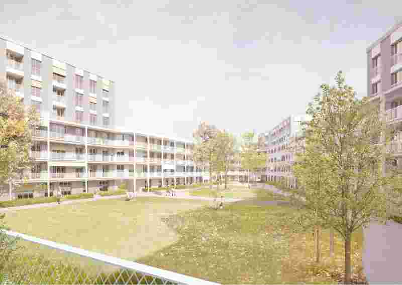 Das Prinzip der Hofbebauung ist: der starke Gegensatz der öffentlichen Außenwelt des Quartiers zur privaten Innenwelt des Hofes. Dies führt zu einer konsequenten Erschließung der Gebäude von Außen. Wenn möglich, profitiert die Wohnsituation von beiden Qualitäten - es wird zu beiden Seiten gewohnt (durchgesteckte Typen). Die umlaufende 4-geschossige Schicht aus Balkonen macht den Hof im Inneren zu einer Einheit.