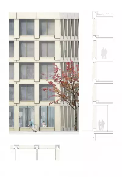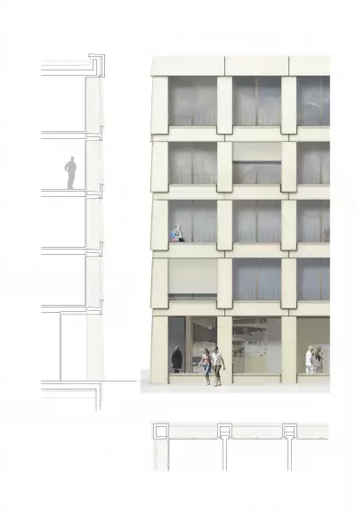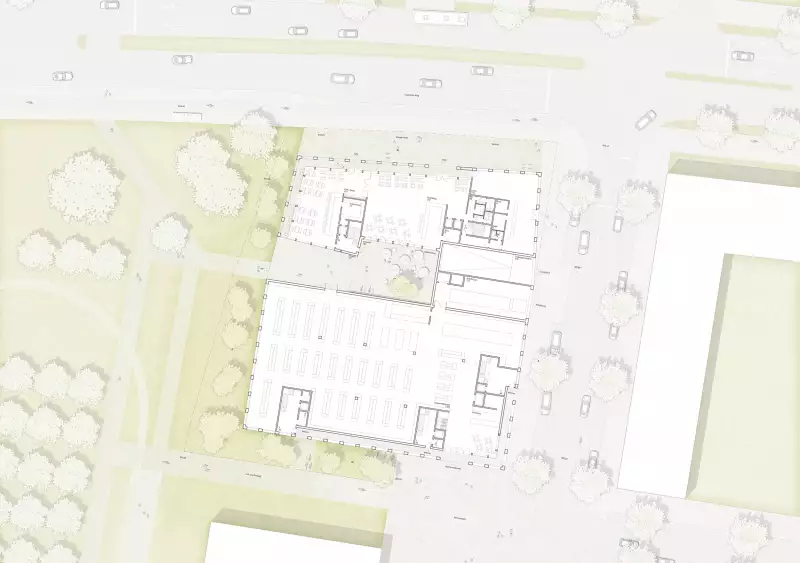 Der ruhige Baukörper erhält durch präzise geometrische Besonderheiten - Knicke und Höhenstafflung - einen ganz eigenständigen Charakter. Die geknickte Flucht zur Max Bill Straße leitet ins Quartier und positioniert den Baukörper mit einem angenehmen Winkel zum Frankfurter Ring. Der Knick zum Grünraum verankert den Baukörper im Gefüge. Beide Knicke proportionieren das Volumen, sorgen für eine wohltuende Maßstäblichkeit und vermitteln zwischen den Richtungen und Räumen. Wichtig dabei ist auch mit der Wesensart der zwei Nutzungen umzugehen und die Einheit des Körpers zu erhalten.