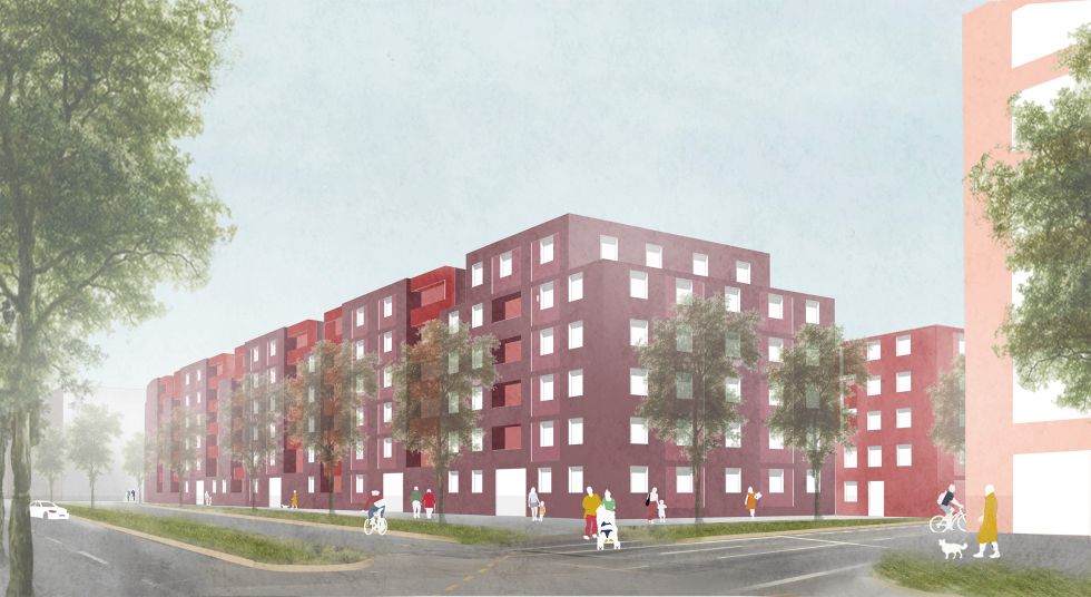 Eine hermetische, rigide Uniformität wird so, bei gleichzeitiger Wiederholung einzelnen Typenhäuser in der Blockform, verhindert. Entsprechend der ursprünglichen städtebaulichen Planung, werden die Gebäude im Geviert des Blocks ohne die durch die GF Mehrung angeregten, siebengeschossigen Dominanten geplant. Die in Aussicht gestellte, zusätzliche Wohnfläche wird vielmehr in einem, gleichmäßig aufgesetztem, rhythmisch durch Terrassen unterbrochenem, sechsten Geschoss nachgewiesen. Entsprechend der Typologie des Blocks als regelhafter Baustein der neuen Stadt, beschränkt sich die Konturierung der Gebäude also auf jeweils eingeschossige wiederkehrende Höhenstaffelungen.
